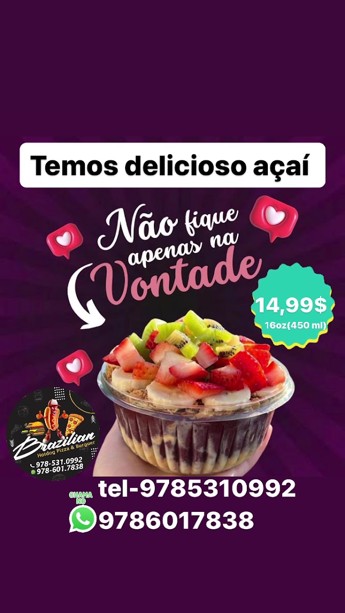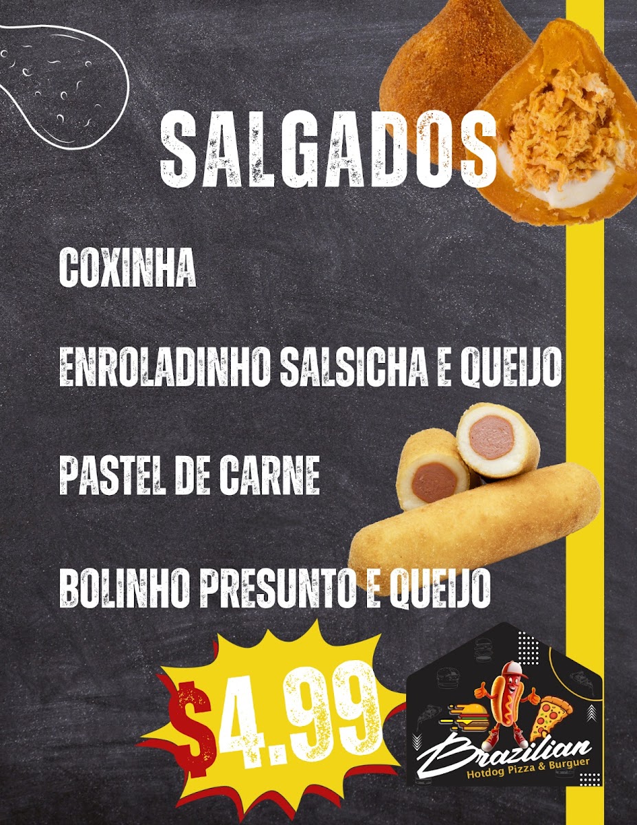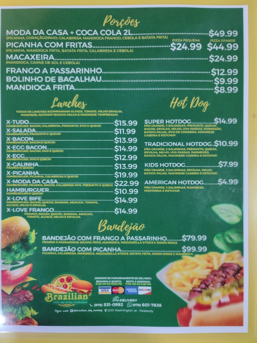 Brazilian Hotdog Pizza & Burger offers a diverse menu filled with both familiar and exciting dishes. For dinner, you can enjoy options like the Grilled Chicken Breast and Picanha Steak or go for something casual with Chicken Fingers and Chicken Wings. The gourmet burger selection is particularly enticing, featuring the Simple Burger and The Monster Burger, along with the Double Cheddar Burger and Crispy Chicken Burger. Sides like French Fries, Cheesy Fries With Bacon, and Mozzarella Sticks perfectly complement these mains. Salads, such as the Garden Salad and Grilled Chicken Caesar Salad, provide a lighter choice. The pasta dishes are a crowd favorite, with options like Pasta With Meatballs, Chicken Parmigiana Pasta, and the rich Pasta With Shrimp Broccoli Alfredo. For something unique, try the Steak & Cheese Hot Dog or the Monster Steak Sub Hot Dog from the hot subs section. The pizza offerings are varied, from the classic Cheese Pizza to more adventurous options like the BBQ Chicken Pizza and Vegetarian Pizza, with Super Bomb Pizza being a standout. If you're in the mood for something different, the Sweet Pizzas, like the Fudge Chocolate & Fresh Strawberry Pizza, are a sweet treat. Hot wraps such as the Steak & Cheese Wrap and Chicken Parmigiana Wrap offer another tasty option, while cold wraps like the Ham & Cheese Wrap cater to lighter tastes. The drink menu includes Soda, Red Bull, and Juice to keep you refreshed. With its wide variety of options and delicious flavors, Brazilian Hotdog Pizza & Burger caters to a range of tastes and ensures that there's something for everyone to enjoy.